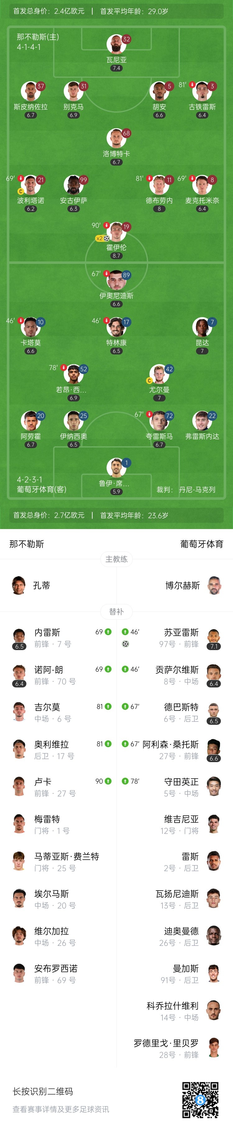 曼市连线!那不勒斯2-1葡体 霍伊伦梅开二度德布劳内助攻双响