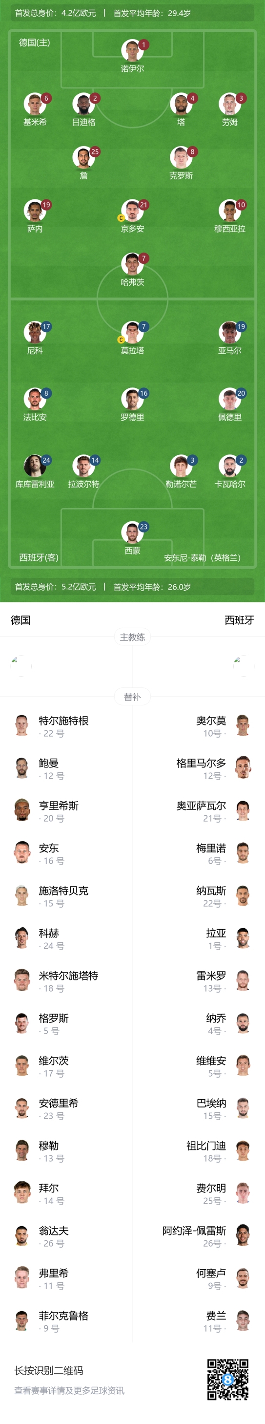 前锋:19-亚马尔(63’ 11-费兰-托雷斯)、7-莫拉塔(80’ 21-奥亚萨瓦尔)、17-尼科-威廉姆斯(80’ 6-梅里诺)