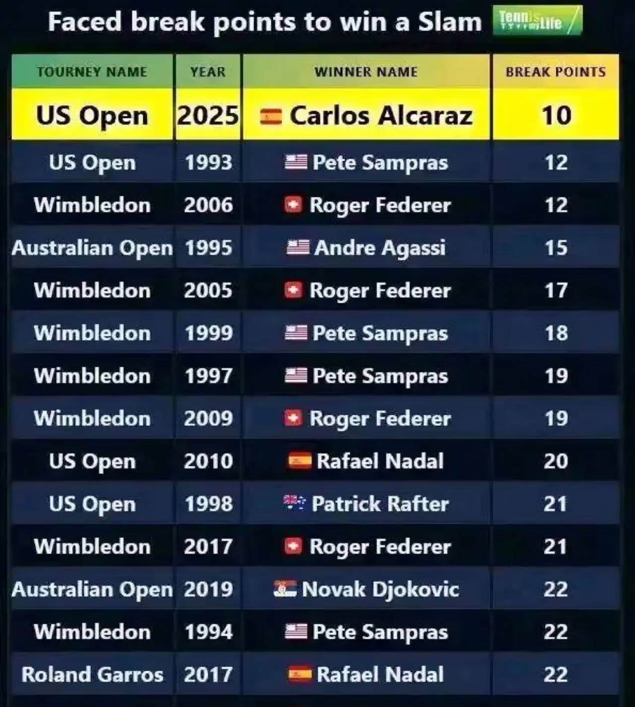 在阿卡之前,并列排在第一的是1993年的桑神和2006年的费牛,两人在各自的后花园美网和温网,整届赛事下来,均只给予对手12个破发点。