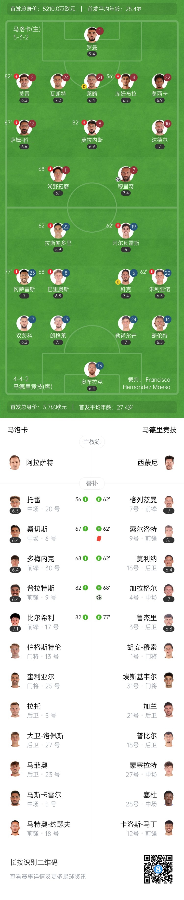 下半场补时7分钟。最终全场比赛结束,马洛卡1-1马竞。