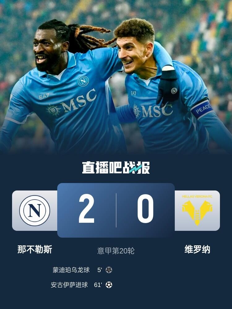 4分领跑!那不勒斯2-0复仇维罗纳 迪洛伦佐造乌龙安古伊萨破门