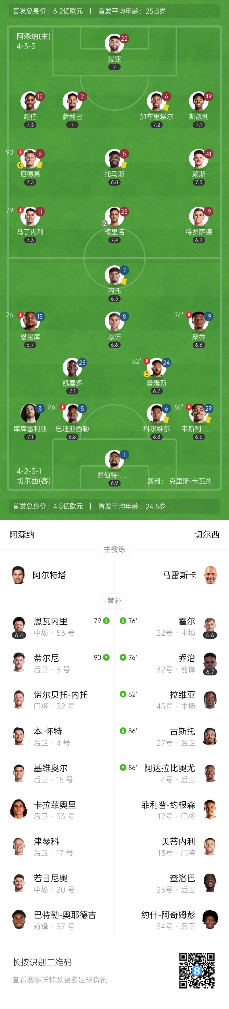 3月16日讯 北京时间3月16日21:30,2024-25赛季英超联赛第29轮焦点战,阿森纳坐镇酋长球场迎战切尔西。上半场梅里诺头球破门,桑切斯险些送礼,拉亚黄油手差点将球漏进自家球门,阿森纳暂1-0切尔西;下半场两队均未改写比分,最终阿森纳1-0切尔西,距榜首12分;切尔西各项赛事四连胜终结。