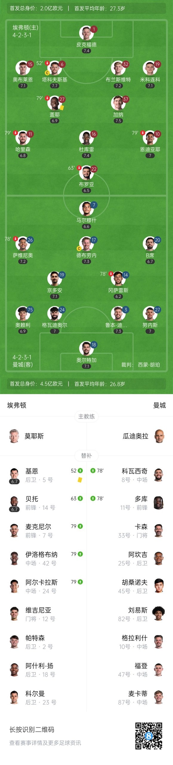 下半场补时5分钟,埃弗顿0-2曼城。