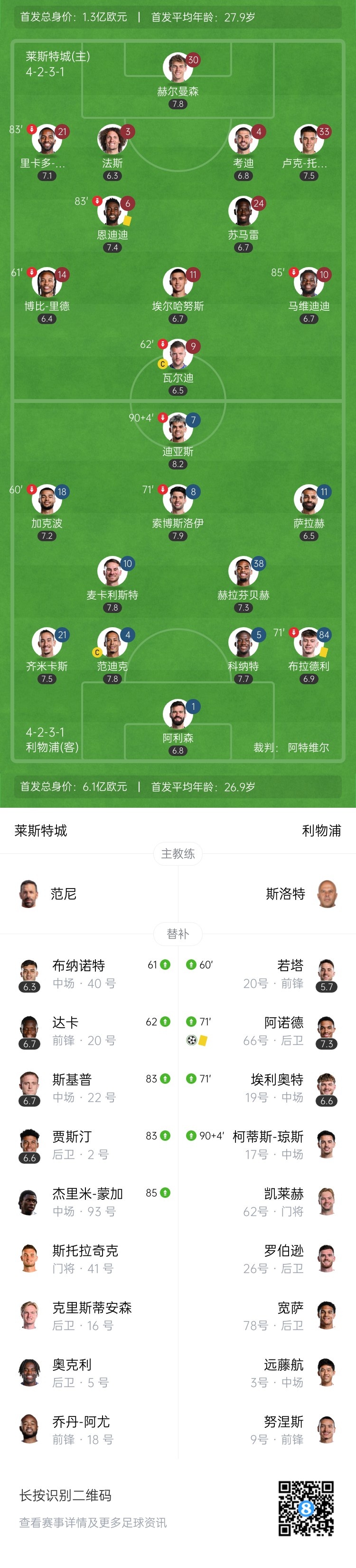 4月21日讯 北京时间4月20日23:30,2024-25赛季英超联赛第33轮,利物浦做客皇权球场挑战莱斯特城。上半场萨拉赫中柱,恩迪迪也射中立柱,莱斯特城0射正,暂0-0战平利物浦;下半场考迪进球被吹,阿诺德制胜&脱衣庆祝染黄,最终利物浦1-0莱斯特城,在还剩5轮比赛的情况下13分领跑,莱斯特城确定降级。
