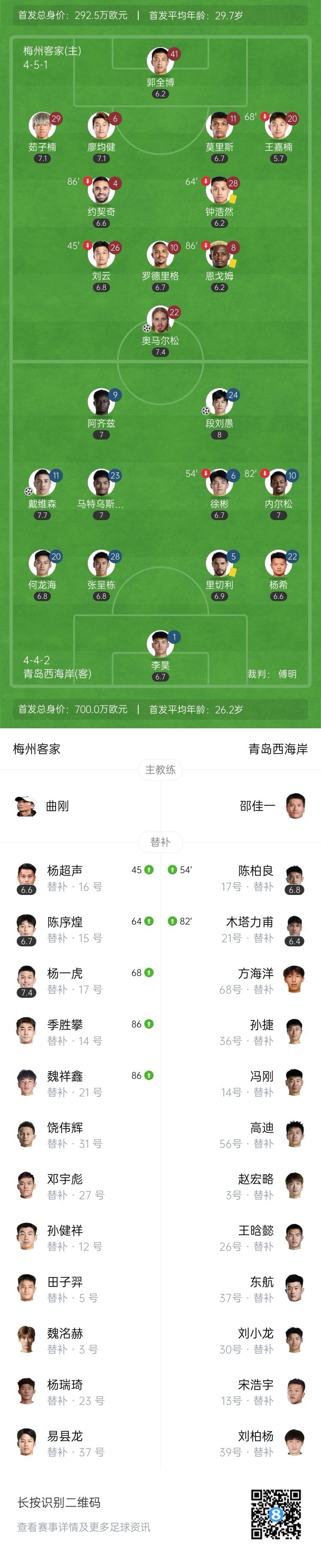 全场比赛结束,梅州客家1-2不敌青岛西海岸。