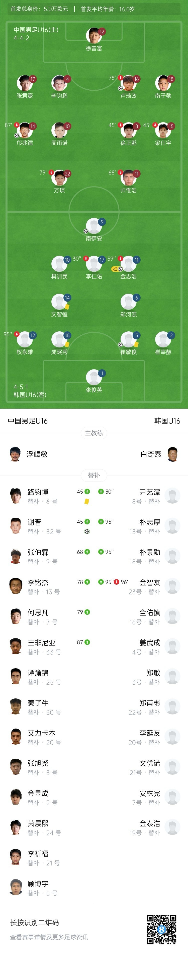第12分钟,韩国国少队扳平比分,文智桓中路分到右边,金志浩跟上打门得手,国少队1-1韩国队。↓