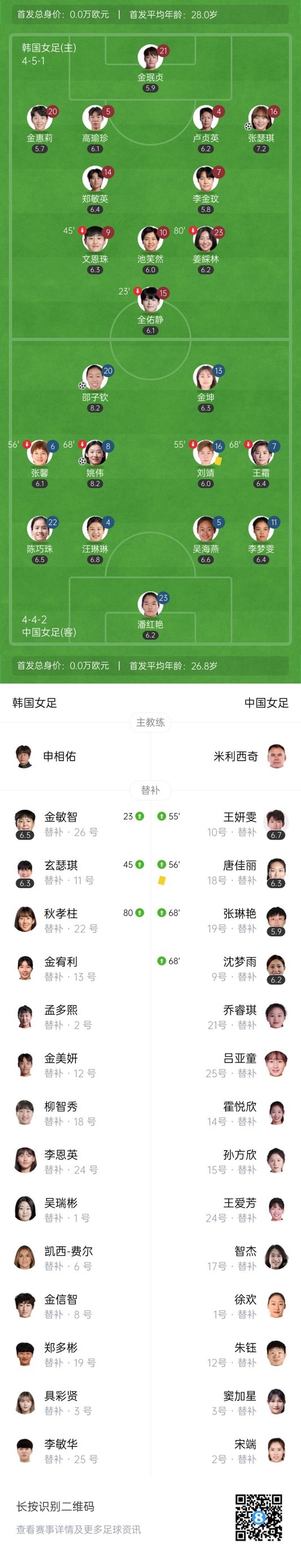 下半场补时5分钟,韩国女足2-2中国女足。