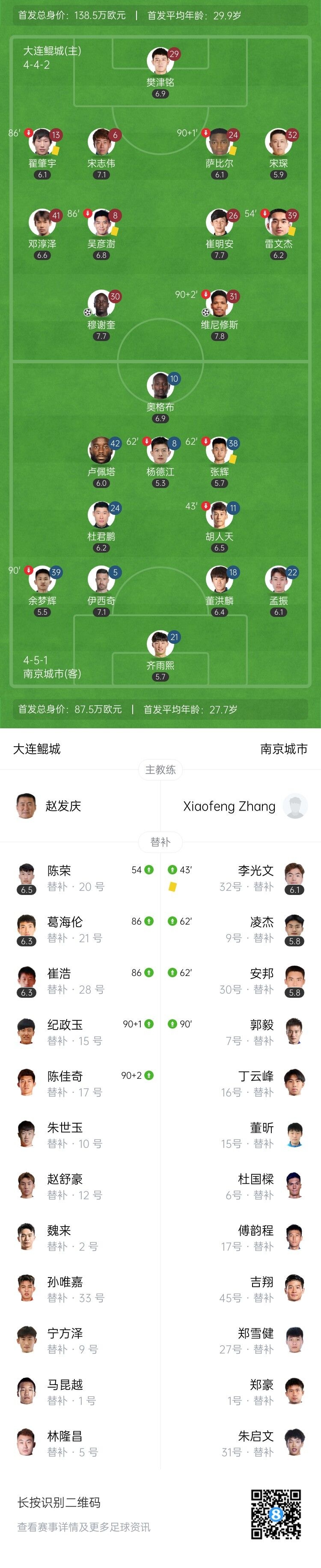 全场比赛结束,大连鲲城3-1南京城市。