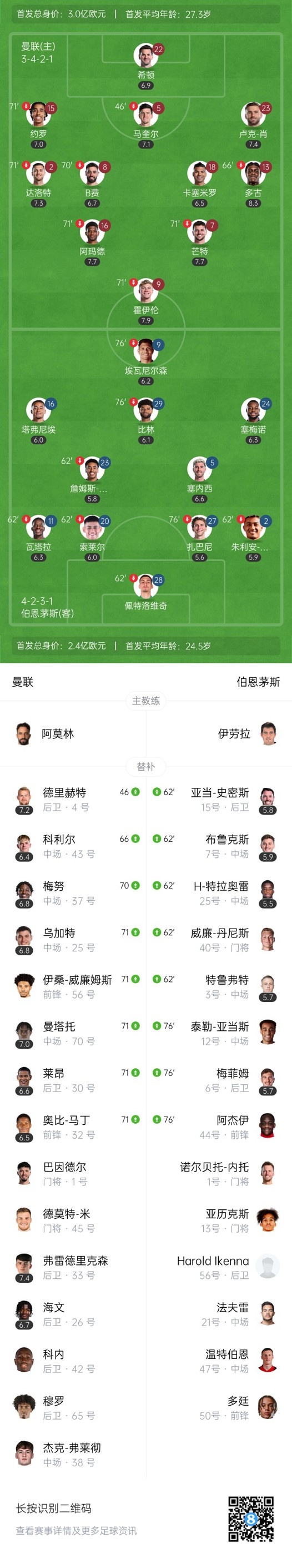 第67分钟,曼联右路角球开到门前德里赫特头球被丹尼斯扑出。↓