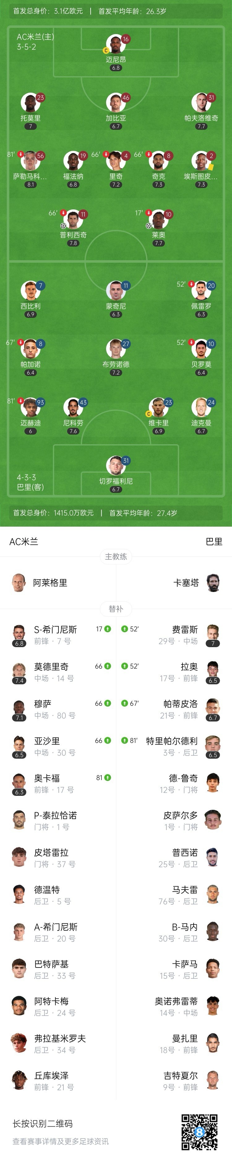 全场比赛结束,AC米兰主场2-0战胜巴里。