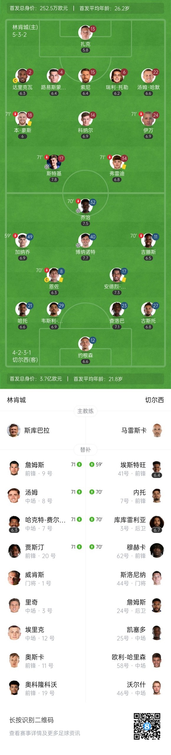 第46分钟,切尔西扳平比分!吉腾斯左路横传防守球员解围不远,中路弧顶乔治远射破门,林肯城1-1切尔西。↓