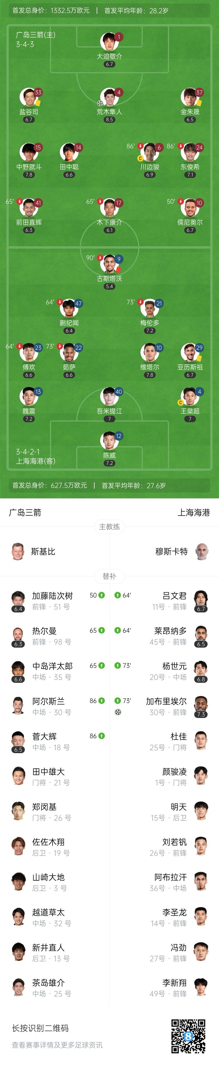 全场比赛结束,海港客场1-1战平广岛三箭。