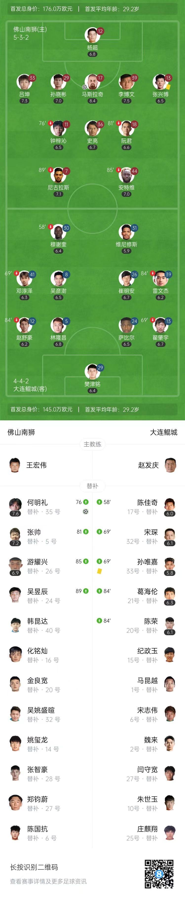 领先降级区4分!佛山南狮2-0大连鲲城 马斯拉奇头槌何明礼世界波