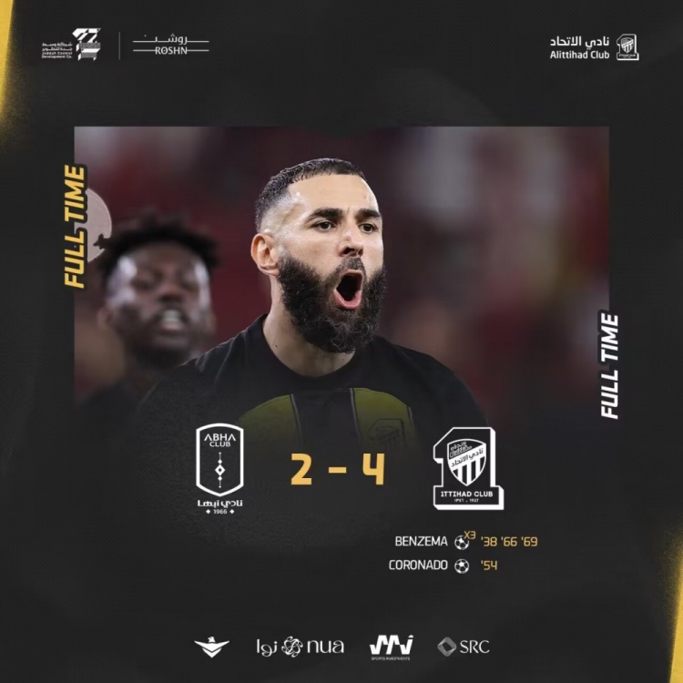 沙特联-本泽马戴帽+助攻 吉达联合4-2艾卜哈终结联赛5轮不胜
