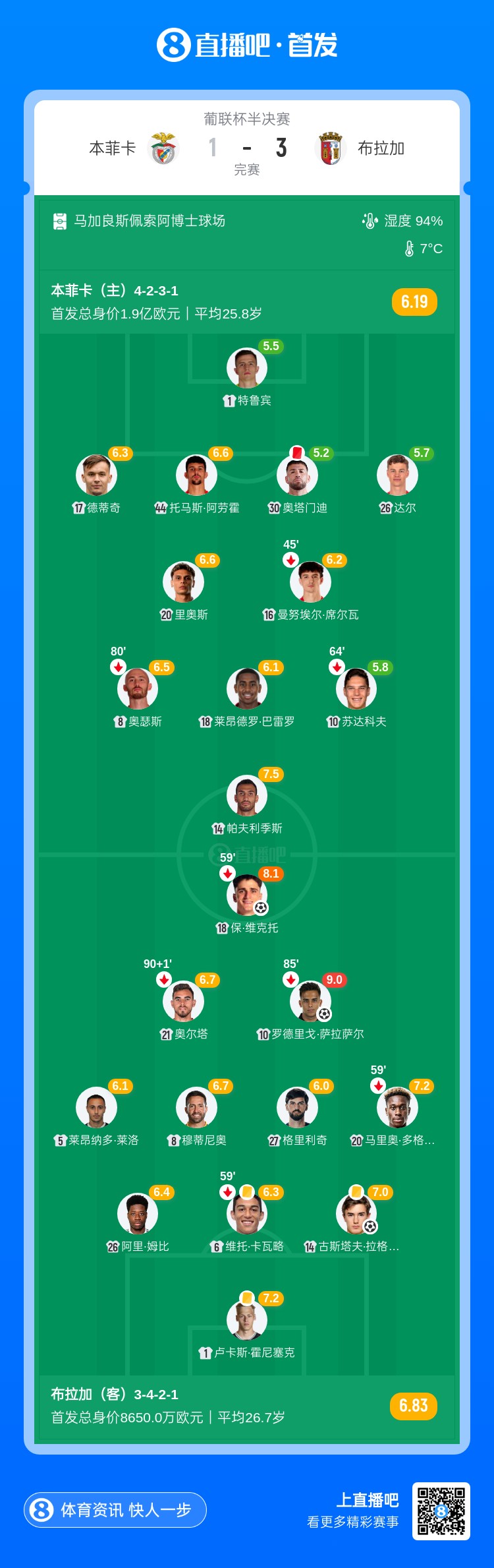 布拉加首发:1-卢卡斯·霍尼塞克、26-阿里·姆比、6-维托·卡瓦略、14-古斯塔夫·拉格比尔克、5-莱昂纳多·莱洛、8-穆蒂尼奥、27-格里利奇、20-马里奥·多格尔斯、21-奥尔塔、10-罗德里戈·萨拉萨尔·马丁内斯、18-保·维克托