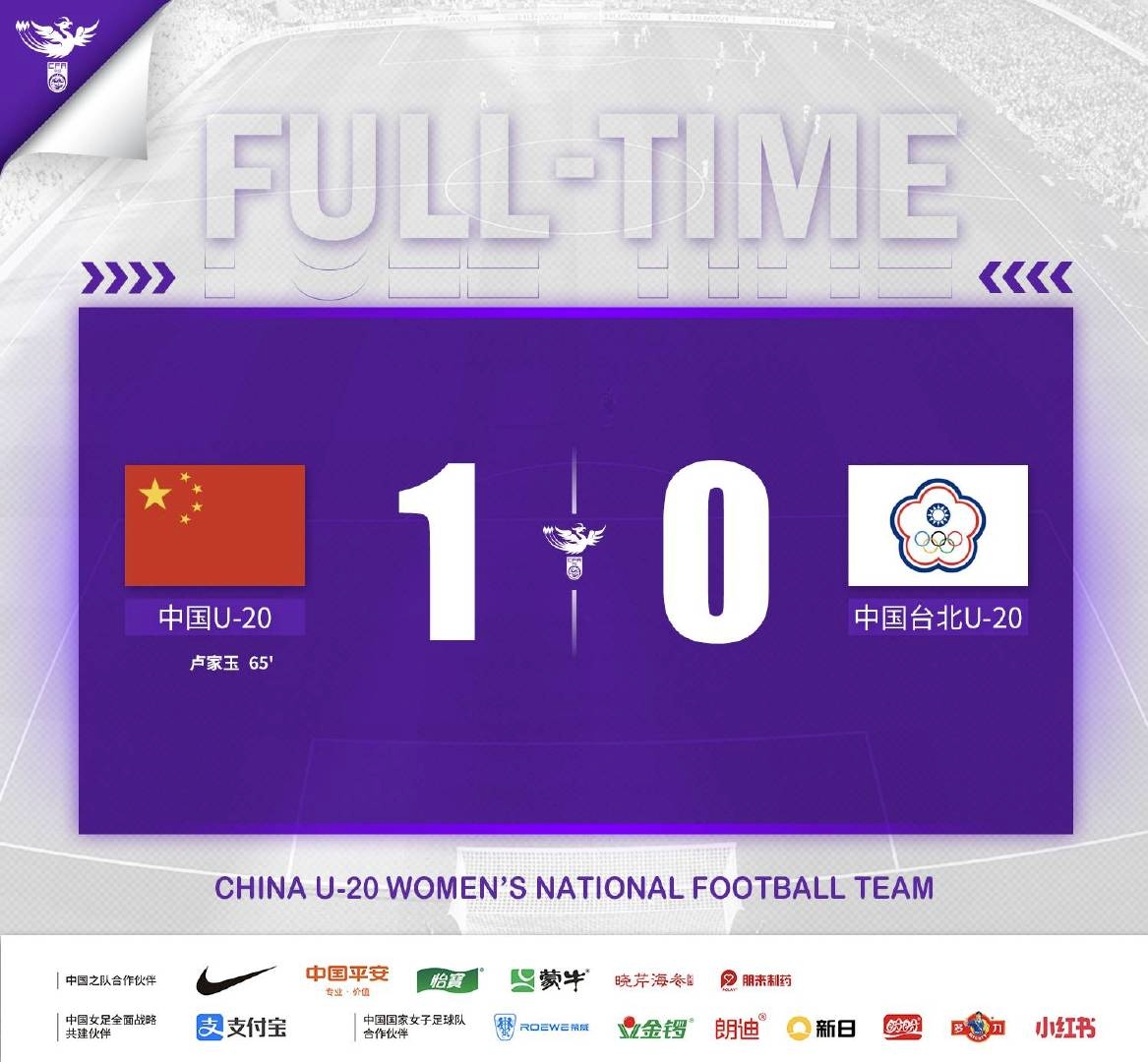 下半场补时7分钟,中国女足1-0中国台北女足。