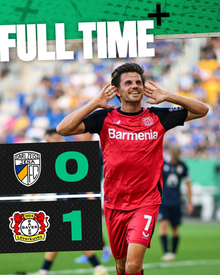 8月29日讯 北京时间8月29日凌晨0:00,德国杯第一轮,勒沃库森客场挑战耶拿。上半场,阿德利两中立柱。下半场,格里马尔多助攻霍夫曼破门。全场结束,勒沃库森1-0耶拿,顺利晋级下一轮。