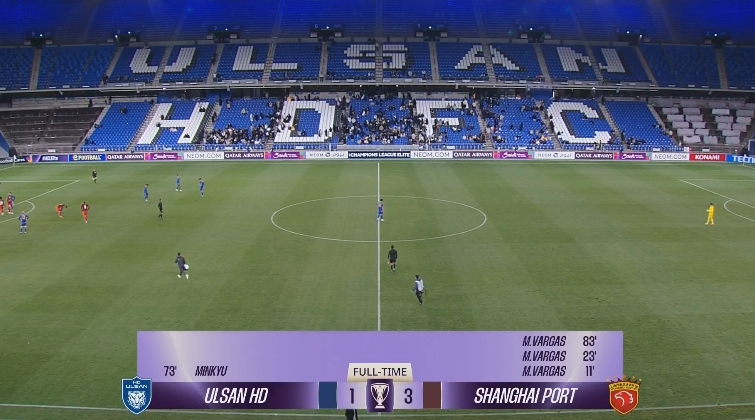 下半场补时4分钟。最终全场比赛结束,十人海港客场3-1蔚山。