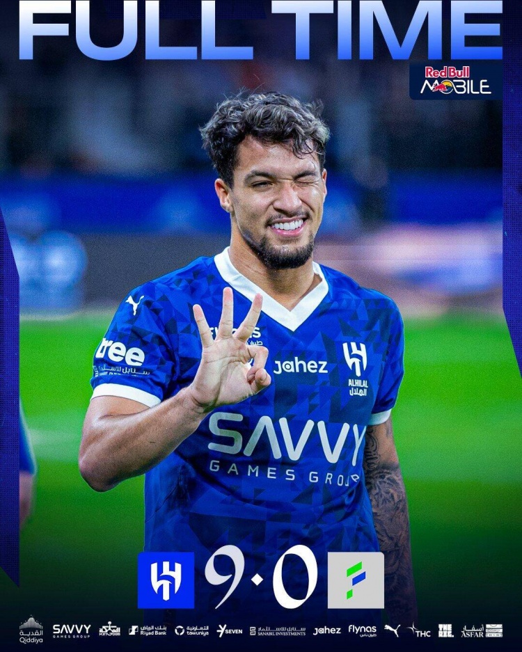 伤停补时2分钟。全场比赛结束,利雅得新月9-0哈萨征服。