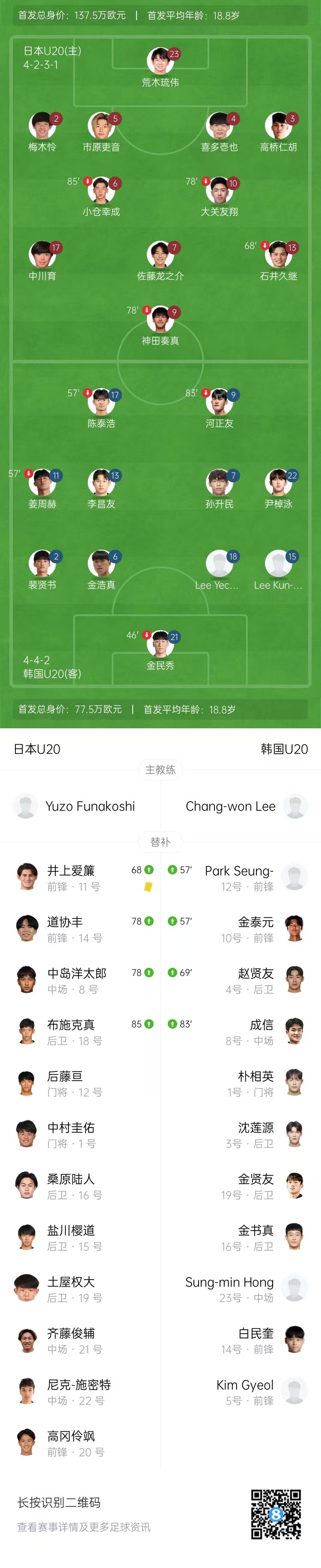 2月20日讯 U20亚洲杯D组第三轮,日本U20对阵韩国U20。上半场,何正友错失半单刀机会,神田奏真抢点打破僵局,荒木琉伟贡献神扑。下半场,金泰万替补登场补时扳平比分。最终日本U20以1-1战平韩国U20。