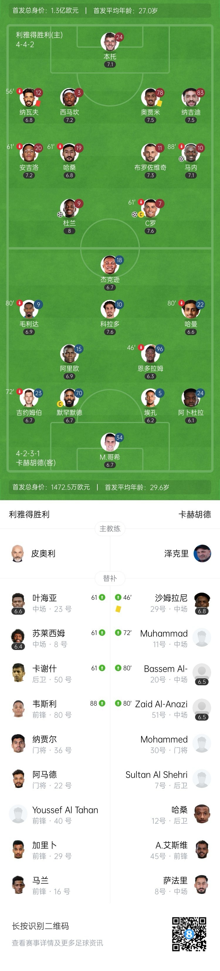 全场比赛结束,十人利雅得胜利主场3-1战胜卡赫胡德。↓