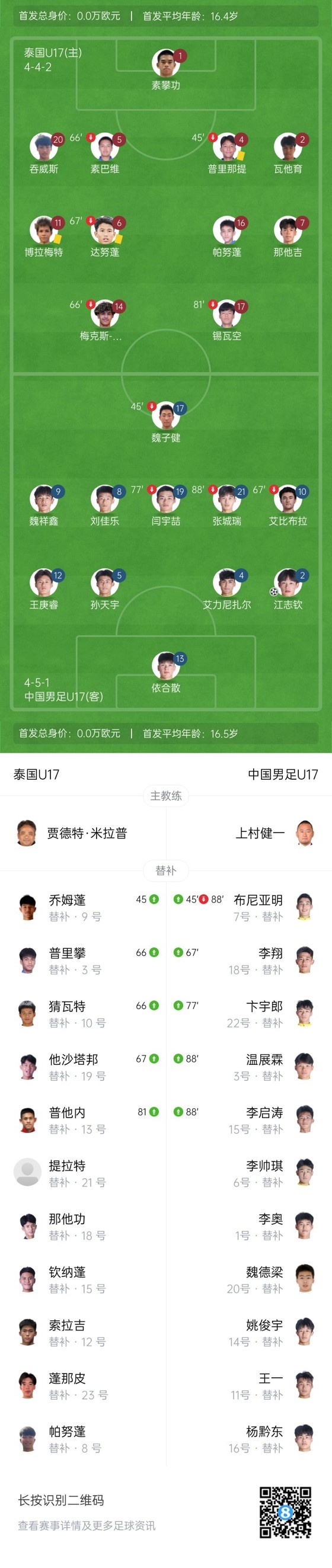 4月10日讯 北京时间4月10日01:15,U17亚洲杯小组赛A组第三轮U17国足迎战泰国U17的比赛在奥卡兹体育场进行,上半场魏祥鑫开场解围险送礼,魏子健屡造险+失良机,下半场布尼亚明造点+点射破门,随后布尼亚明助攻江志钦推射破门再下一城,魏祥鑫失空门,最终国少2-0泰国取得首胜,国少1胜2负小组第3收官。