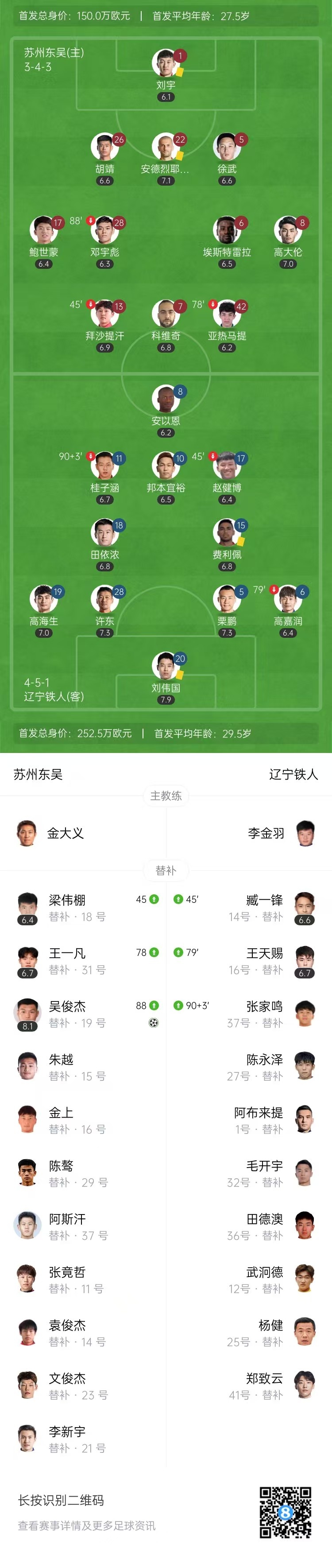第90分钟,东吴左路送出传中,吴俊杰抢点得手扳平比分,苏州东吴1-1辽宁铁人。↓
